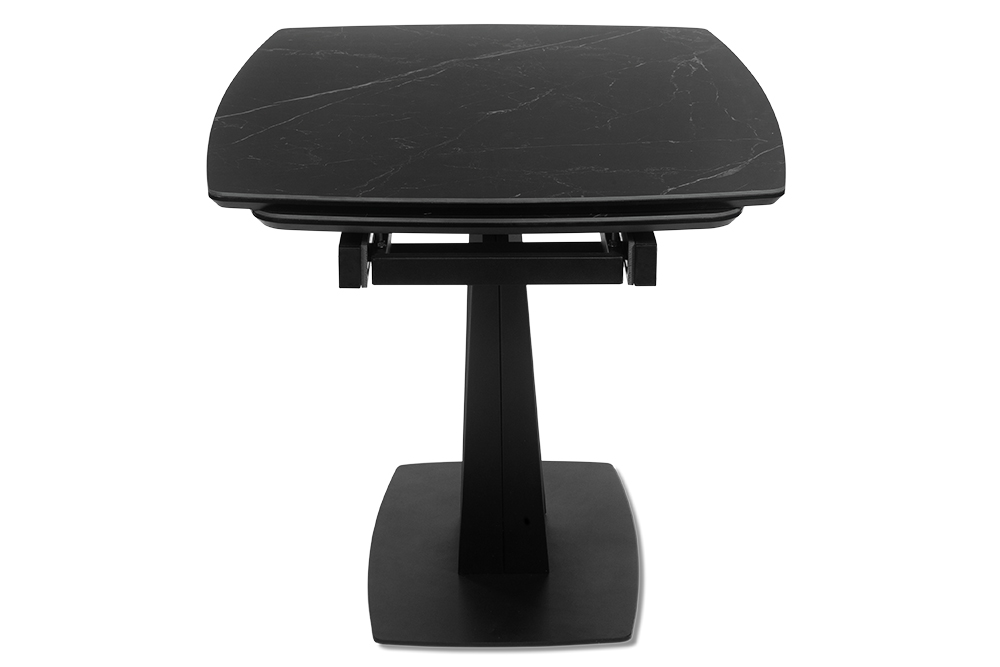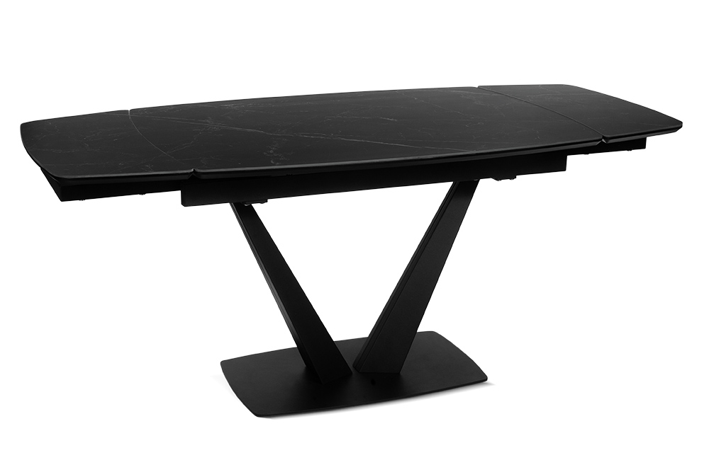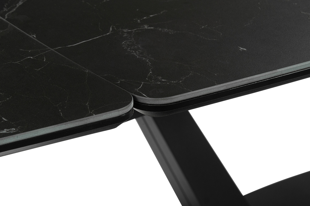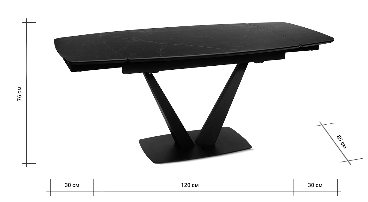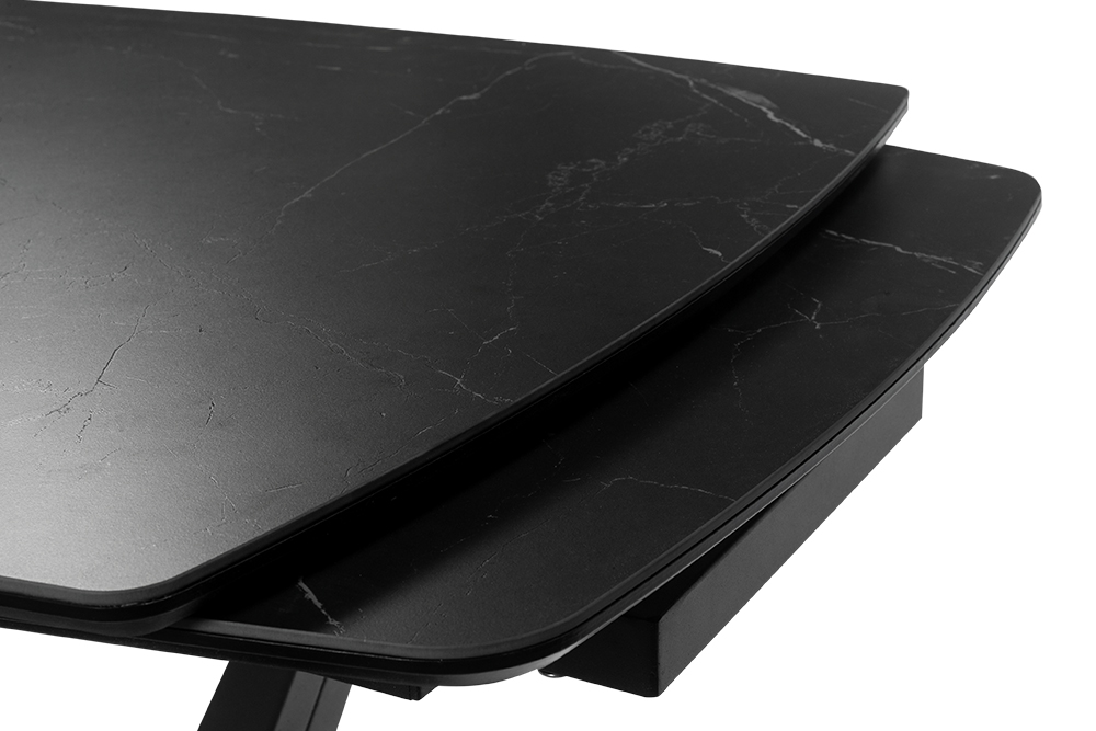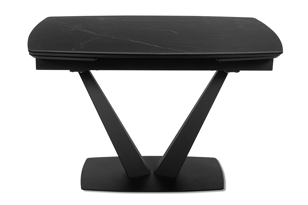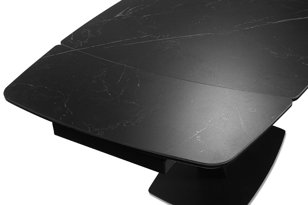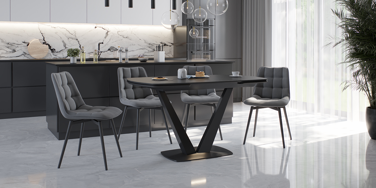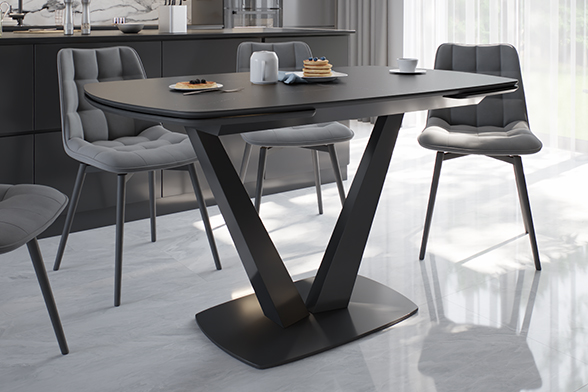 CHALET LIGHT 120 NERO CER — обеденный стол, который адаптируется под ваши сценарии жизни, оставаясь центром стиля и комфорта. Строгий силуэт длиной 120 см с закругленными краями идеально вписывается в пространство, а боковые вставки позволяют мгновенно увеличить стол на 30 см с каждой стороны для приема гостей или семейных праздников. Столешница из черной керамики сочетает эстетику с практичностью: устойчива к царапинам, горячим посудам и пятнам, сохраняя безупречный матовый вид годами. Керамика не выцветает и не требует сложного ухода — достаточно протереть поверхность влажной салфеткой. Подложка из МДФ усиливает конструкцию, обеспечивая дополнительную прочность и долговечность. Основание V-образной формы из металла черного цвета придает столу устойчивость и визуальную легкость, гармонируя с интерьерами в стиле минимализм, лофт или сканди.