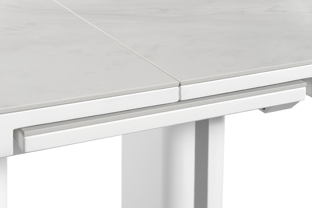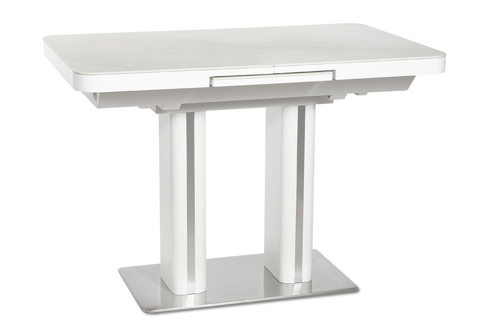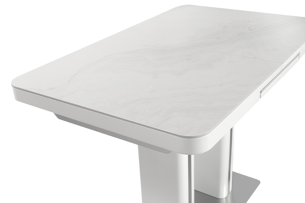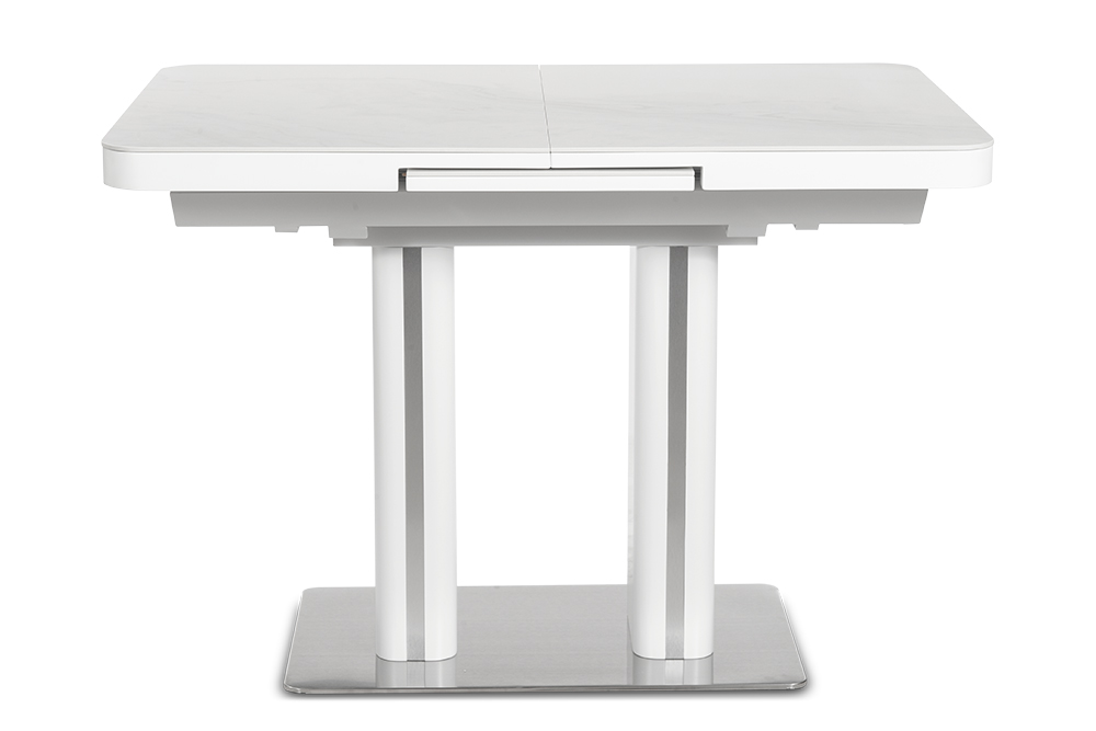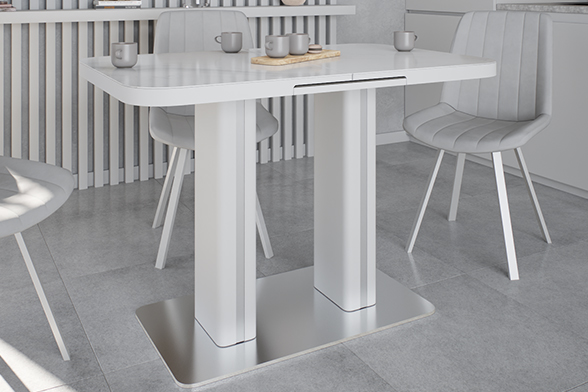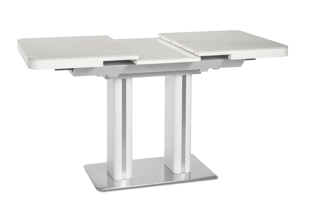 Обеденный стол DARIO 110 MILKY WAY SH — компактное решение для современного интерьера. При длине 110 см он легко помещается в небольшом пространстве, а уникальный автоматический синхронный механизм позволяет одним движением увеличить стол на 35 см — просто потяните за одну сторону стола, и центральная вставка плавно раскроется, создавая дополнительное место для гостей. Столешница из импортной глянцевой керамики с уникальным рисунком «Млечный путь» станет главным акцентом вашей кухни. Керамика обладает исключительной стойкостью к высоким температурам и бытовым загрязнениям, не теряя со временем глубины цвета и благородного блеска. Опора из нержавеющей стали (70х40 см) гарантирует максимальную устойчивость и долговечность, а элегантные хромированные вставки на ножках добавляют интерьеру современный штрих.
