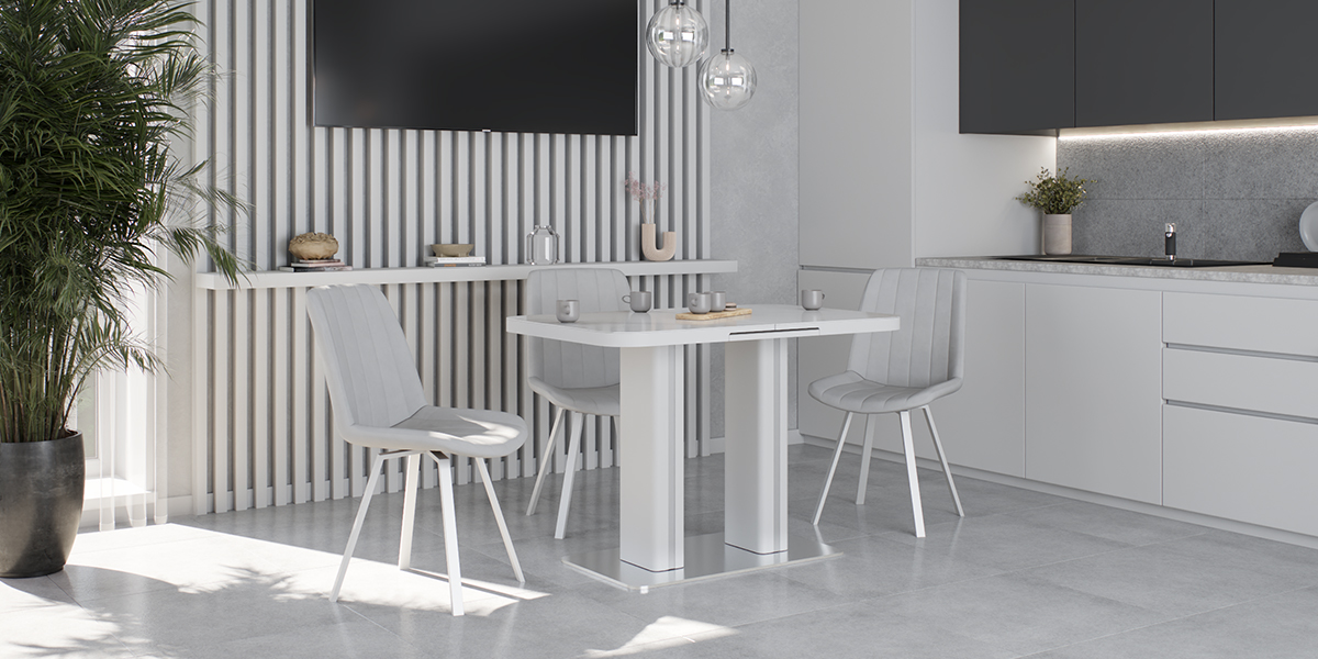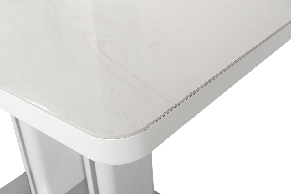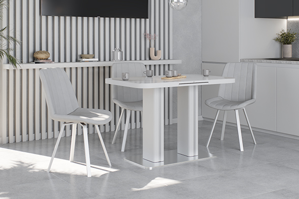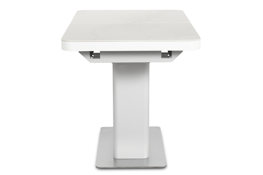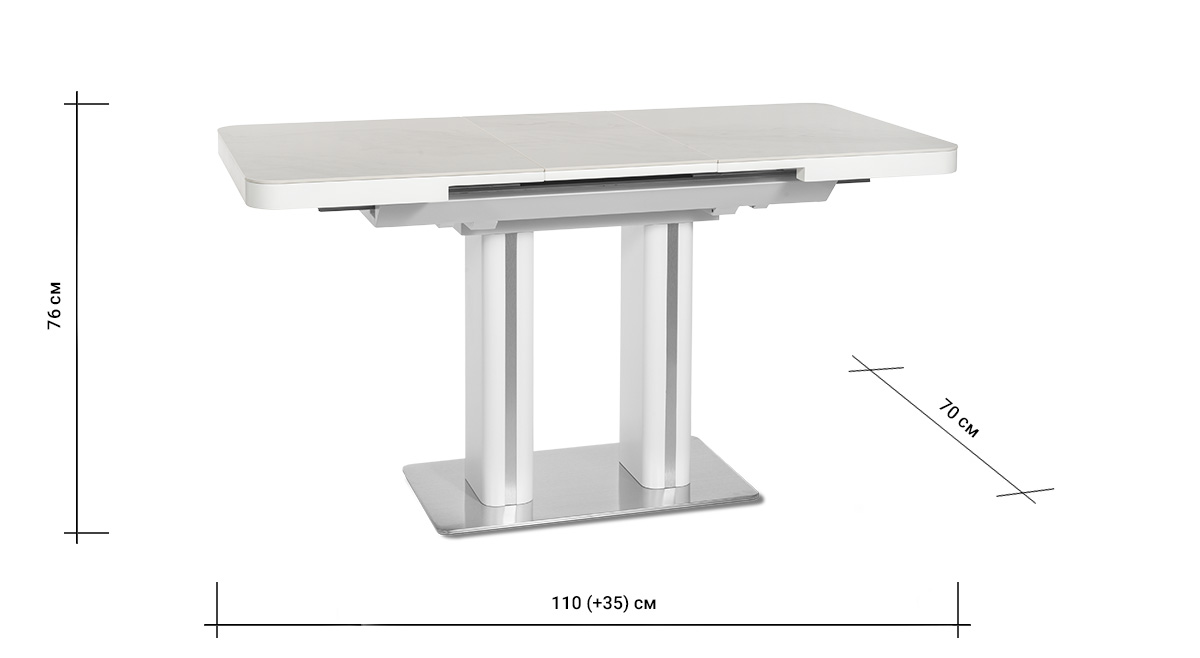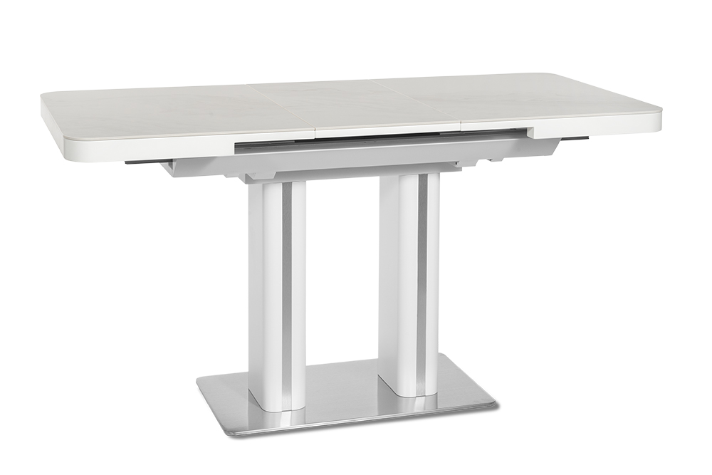Обеденный стол DARIO 110 MILKY WAY SH — компактное решение для современного интерьера. При длине 110 см он легко помещается в небольшом пространстве, а уникальный автоматический синхронный механизм позволяет одним движением увеличить стол на 35 см — просто потяните за одну сторону стола, и центральная вставка плавно раскроется, создавая дополнительное место для гостей. Столешница из импортной глянцевой керамики с уникальным рисунком «Млечный путь» станет главным акцентом вашей кухни. Керамика обладает исключительной стойкостью к высоким температурам и бытовым загрязнениям, не теряя со временем глубины цвета и благородного блеска. Опора из нержавеющей стали (70х40 см) гарантирует максимальную устойчивость и долговечность, а элегантные хромированные вставки на ножках добавляют интерьеру современный штрих.