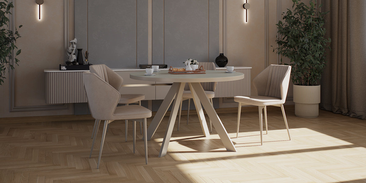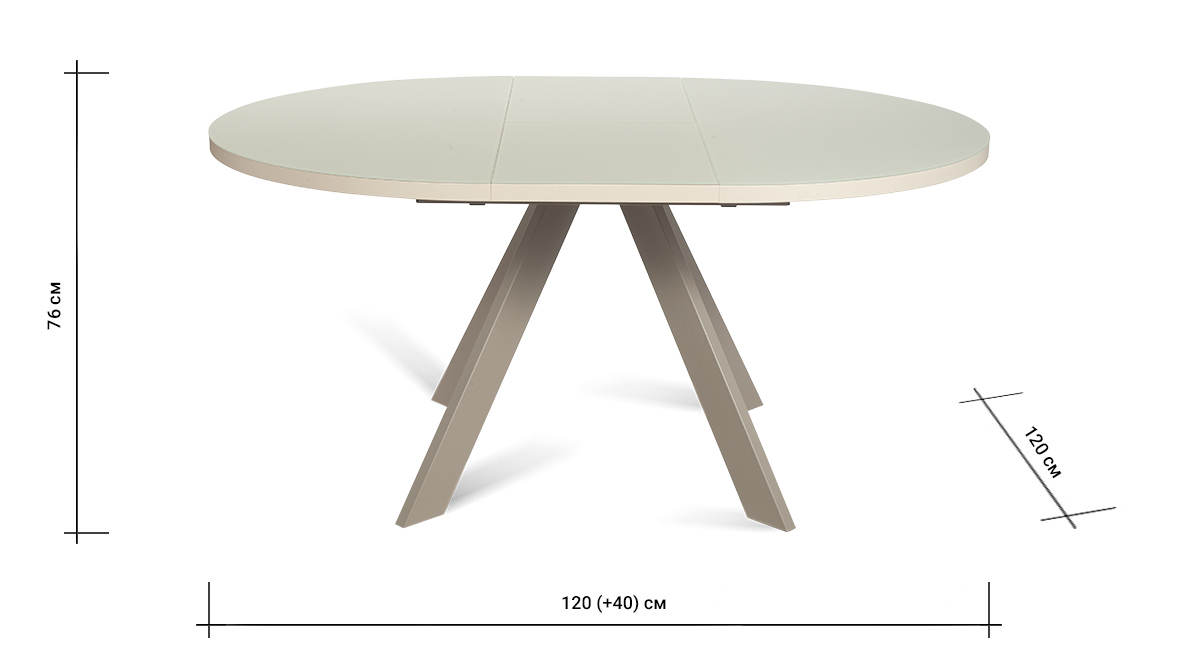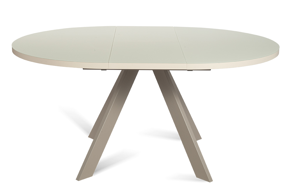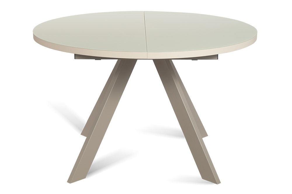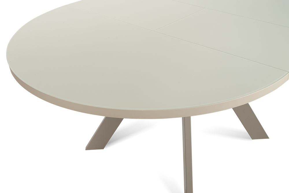 Стол FARGO 120 CAP SILK — воплощение современного минимализма. Модель с правильной круглой формой легко раскладывается вручную, увеличивая длину на 40 см. Эстетику и практичность в этой модели объединяет столешница из матового закаленного стекла элегантного оттенка «капучино». Этот материал отличается высокой прочностью и долговечностью, а также простотой в уходе — для поддержания чистоты не требуются специальные средства. Визуальную легкость и устойчивость конструкции обеспечивает надежная опора из четырех стальных ножек приглушенного бежевого цвета.