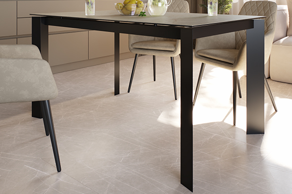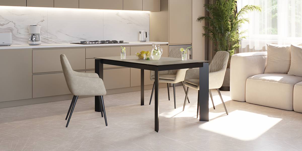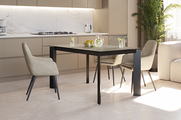 Обеденный стол NEVADA 140 MICHIGAN CER BK — строгий прямоугольный силуэт размером 140x85 см органично впишется в любое в пространство, а благодаря телескопическому механизму раскладки стол легко увеличивается на 50 см, создавая комфортную зону для приема гостей. Столешница из импортной керамики с изысканной текстурой под бежевый кварцит сочетает эстетику с практичностью. Керамика обладает исключительной стойкостью к высоким температурам, царапинам и бытовым загрязнениям. Материал сохраняет первоначальный вид на протяжении долгих лет, не требуя специального ухода. Монолитные ножки из черного металла дополняют лаконичный образ, придавая конструкции прочность и визуальную легкость. NEVADA 140 MICHIGAN CER BK — выбор для тех, кто ценит эргономику и сдержанную элегантность.