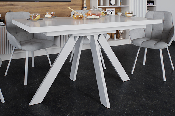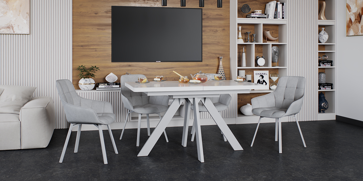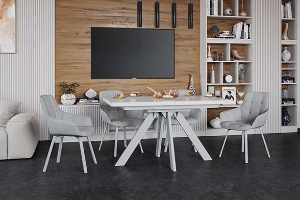 Идеальное сочетание стиля и функциональности - обеденный стол NORWAY140 WHITE GLASS W. Этот стол привлекает внимание своей стильной столешницей из закаленного стекла в белом цвете, обладающей не только роскошным оттенком, но и высокой прочностью, а также термостойкостью. Полуавтоматический механизм раскладывания добавляет удобства вашей жизни, позволяя вам легко увеличивать размер стола на 40 см по мере необходимости. Это особенно удобно при приеме гостей или организации семейных ужинов. Лучевидные ножки белого цвета, исходящие из центра стола, создают стабильную основу и визуально придают легкость дизайну. Этот стол не только функционален, но и станет изысканным акцентом в вашем интерьере.