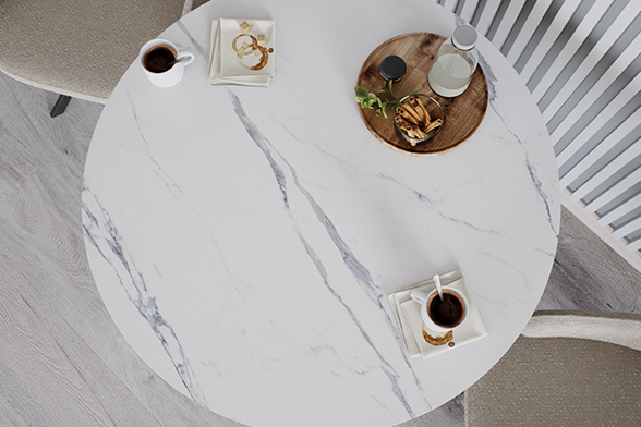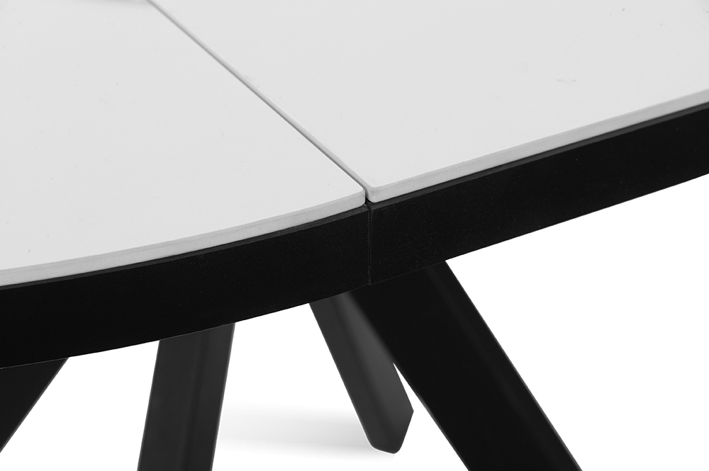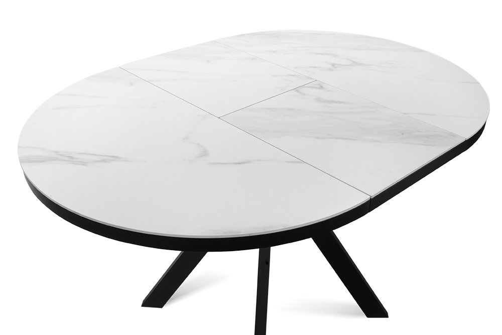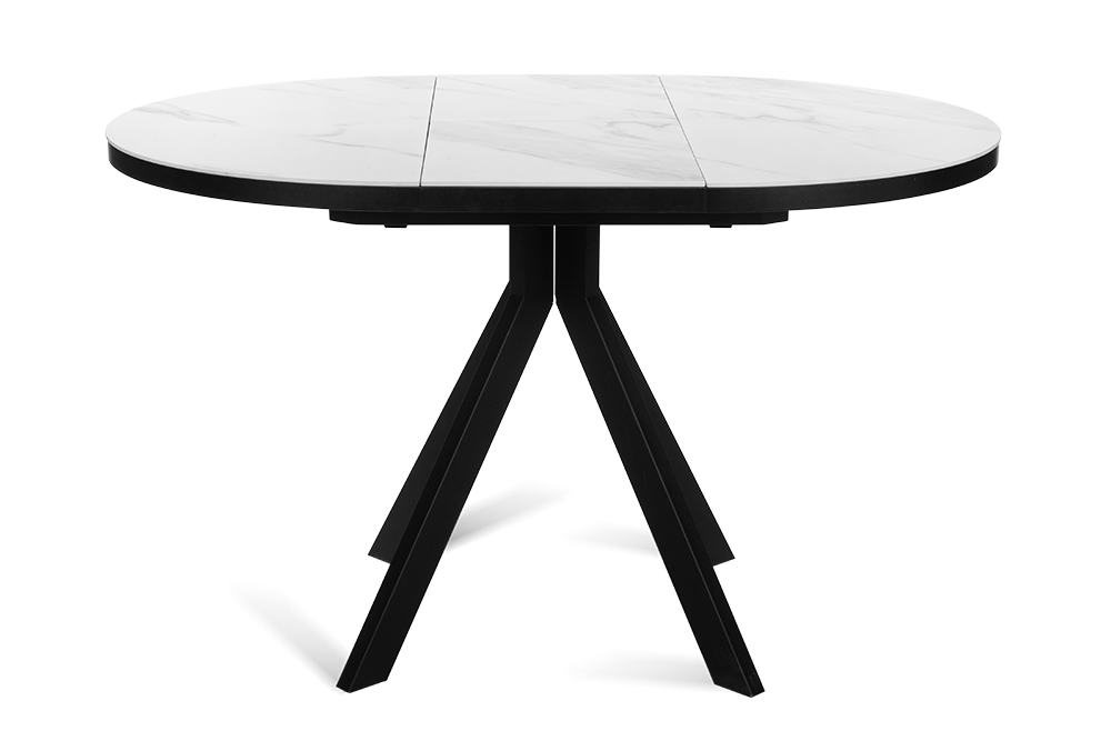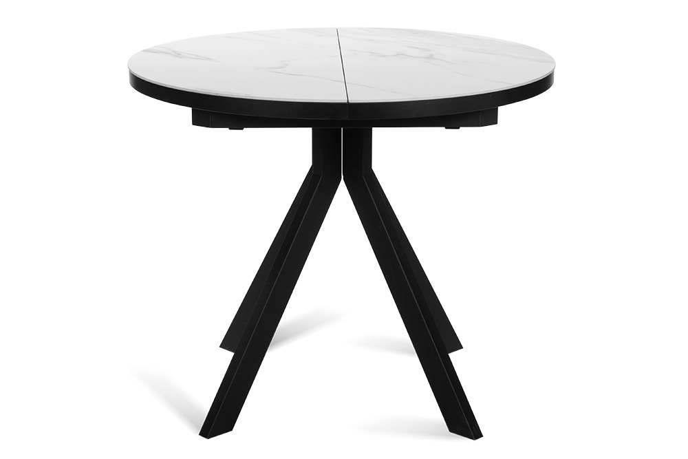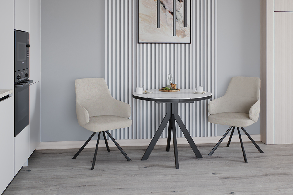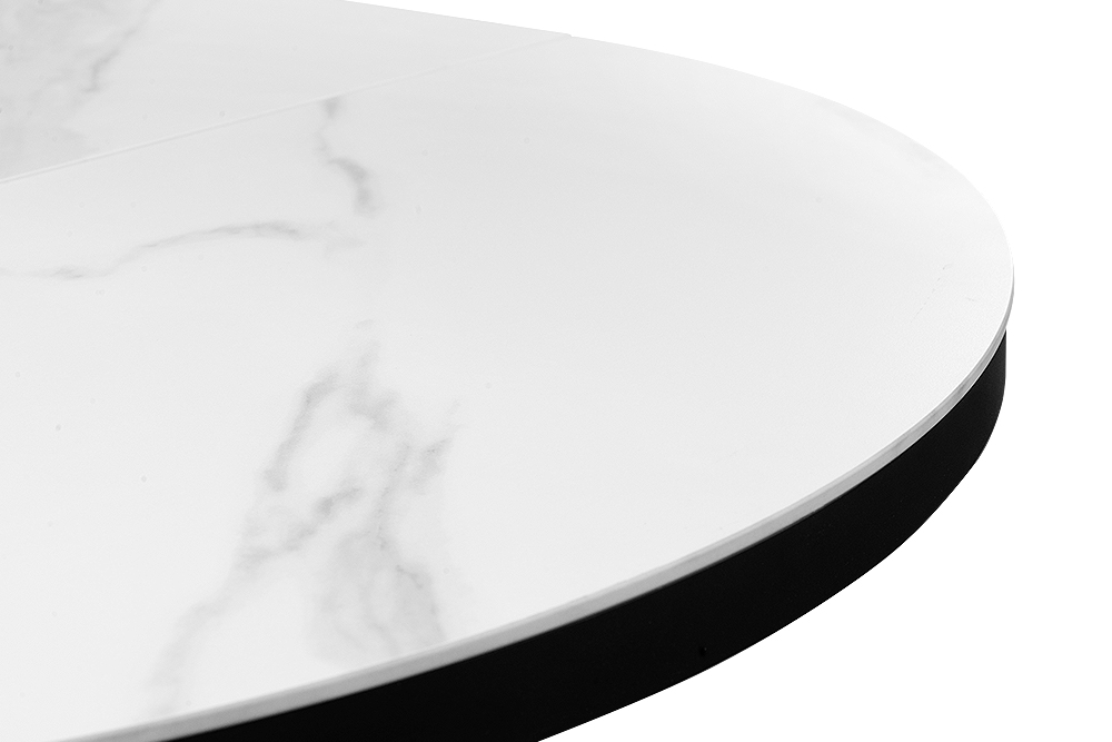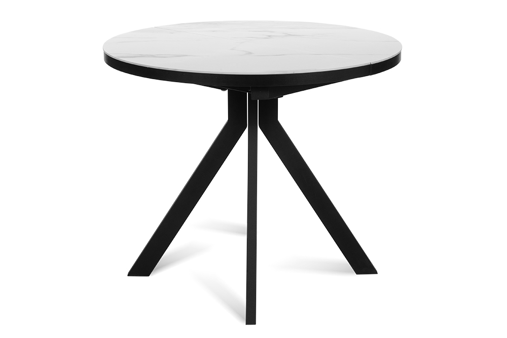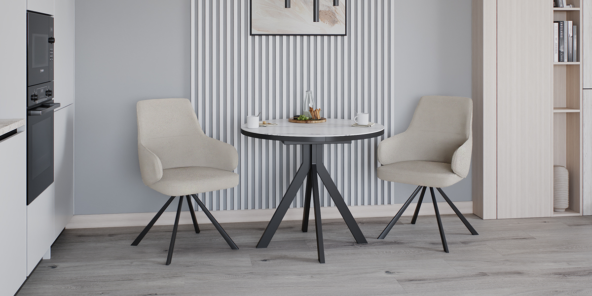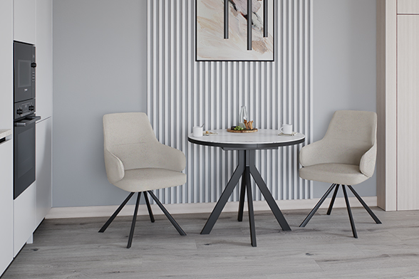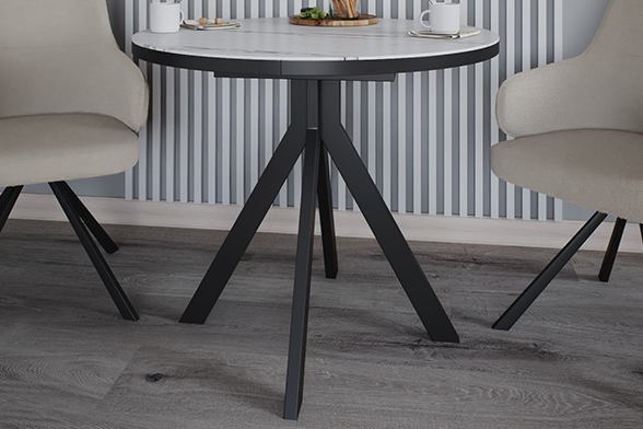 Обеденный стол OSAKA 90 MARBLE MATT CER — идеальный баланс компактности и функциональности для современных интерьеров. Его лаконичный дизайн в стиле минимализма с круглой столешницей диаметром 90 см гармонично впишется даже в небольшие пространства, сохраняя эстетику и удобство. Полуавтоматический механизм раскладывания за секунды увеличивает длину стола на 35 см: от уютного семейного ужина до вечеринки с друзьями — всё возможно без лишних усилий. Столешница и вставка из керамики белого цвета под мрамор сочетают элегантность с исключительной практичностью. Керамика устойчива к царапинам, горячим блюдам и повседневным нагрузкам, не теряя первоначальной формы и цвета. За ней легко ухаживать — даже самые стойкие пятна исчезают после легкого движения салфетки. Прочность материала гарантирует, что стол годами будет выглядеть как новый, несмотря на активное использование. Четыре металлические ножки черного цвета, расходящиеся книзу, придают конструкции надежность и визуальную легкость, дополняя современный интерьер сдержанной выразительностью.