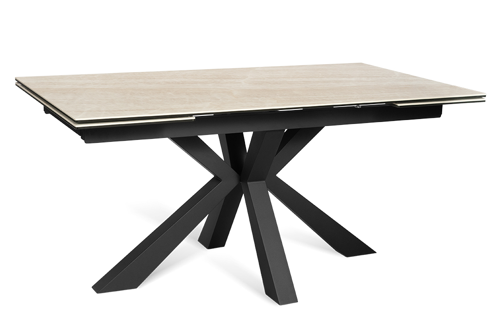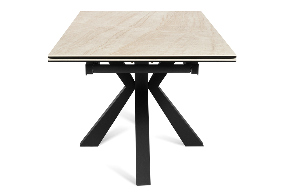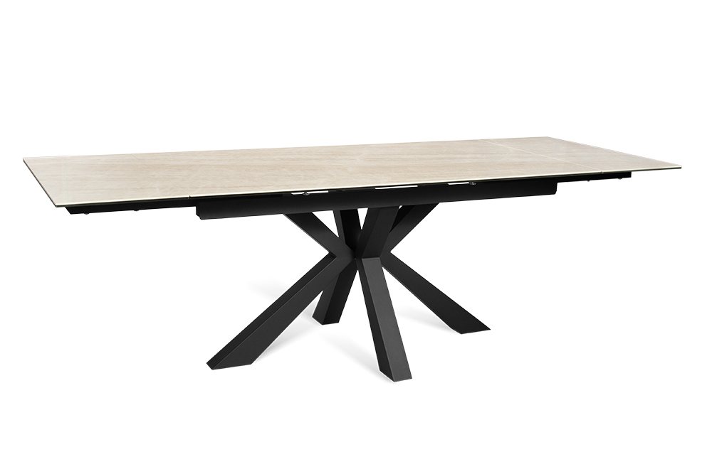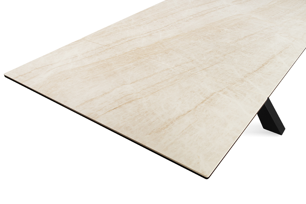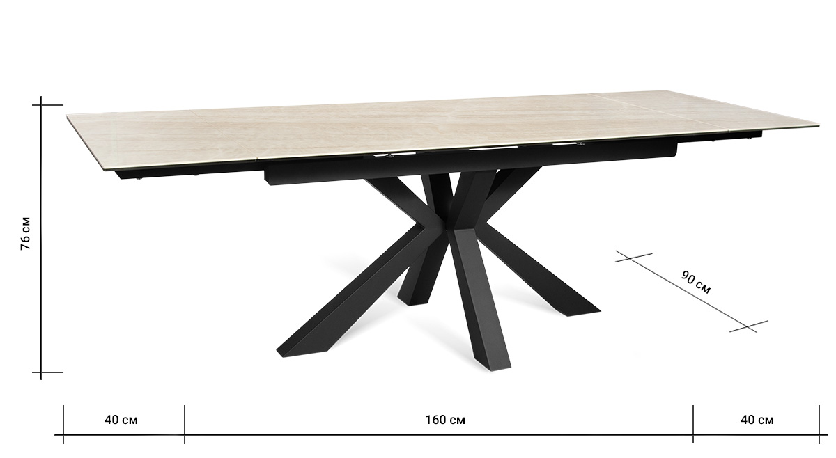 SPARTA 160 DESERT CER BK представляет собой массивный и просторный стол, который будет идеально смотреться в качестве обеденного стола на вашей кухне или в гостиной. Одно из главных преимуществ данной модели – ее основательный каркас из нержавеющей стали, окрашенной в черный цвет. Ножки стола имеют внушительную толщину и необычно изогнутую форму, обеспечивая ему повышенную устойчивость и стильный дизайн. Керамическая столешница изделия обладает песочным цветом с выразительным рисунком. А современный раскладной механизм ручного типа позволяет за считанные секунды увеличить ее длину на 80 см.