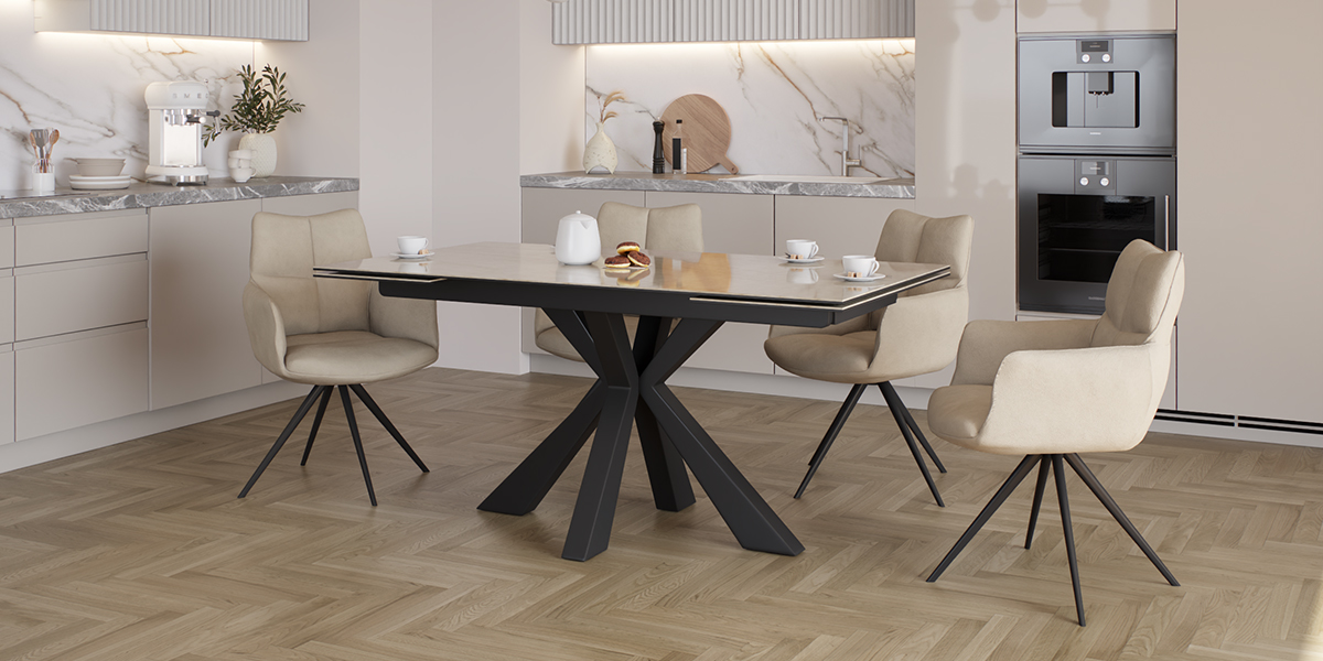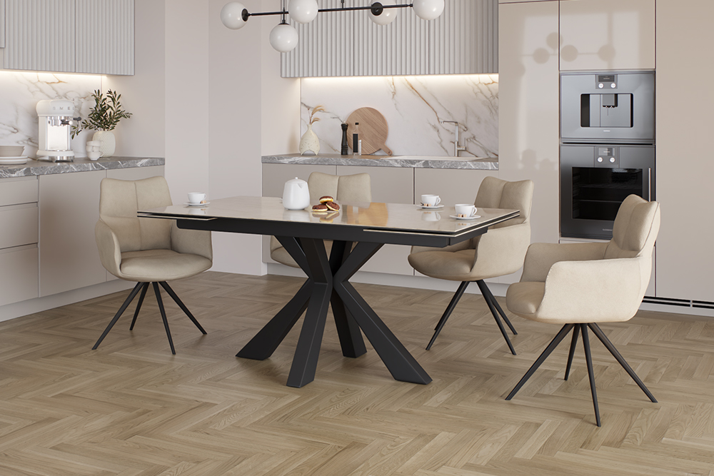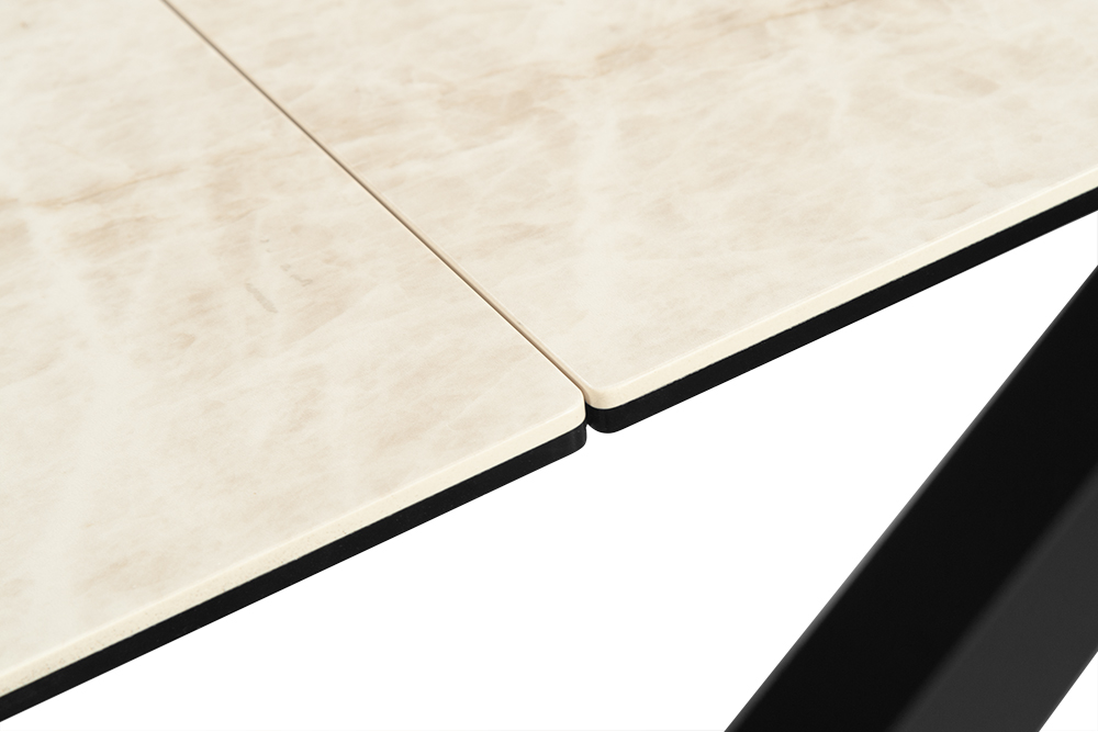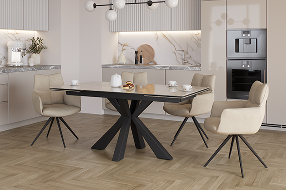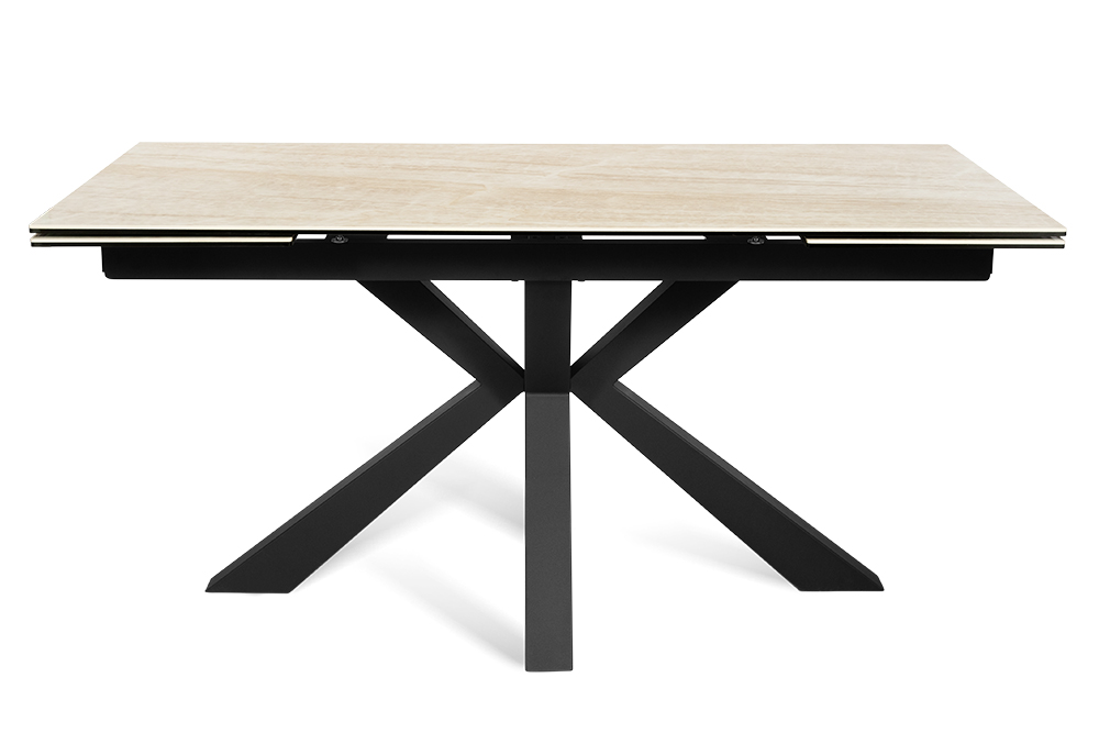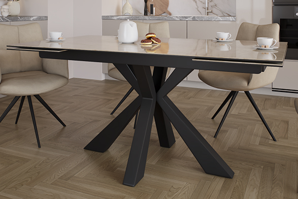 SPARTA 160 DESERT CER BK представляет собой массивный и просторный стол, который будет идеально смотреться в качестве обеденного стола на вашей кухне или в гостиной. Одно из главных преимуществ данной модели – ее основательный каркас из нержавеющей стали, окрашенной в черный цвет. Ножки стола имеют внушительную толщину и необычно изогнутую форму, обеспечивая ему повышенную устойчивость и стильный дизайн. Керамическая столешница изделия обладает песочным цветом с выразительным рисунком. А современный раскладной механизм ручного типа позволяет за считанные секунды увеличить ее длину на 80 см.