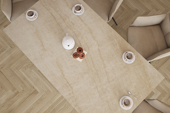 Керамика — эстетичный и благородный натуральный материал, представленный в разнообразных оттенках и фактурах. Выполненные из него столешницы служат десятилетиями: за счет плотной структуры и высокой прочности им не страшны царапины, постоянный прямой контакт с влагой и перепады температуры.