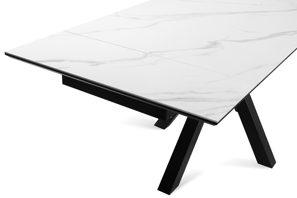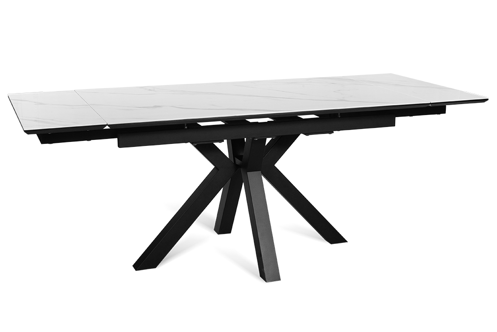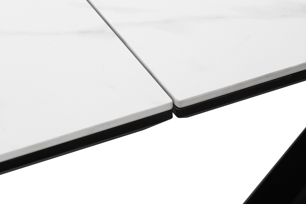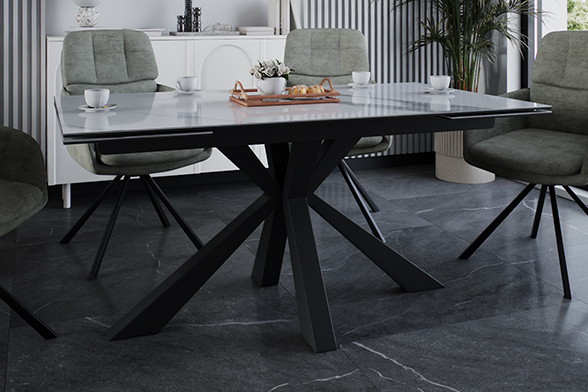 Обеденный стол SPARTA LIGHT 140 MARBLE CER — современная эстетика и стильный центр притяжения. Его мощные изогнутые ножки придают конструкции не только устойчивость, но и динамичный характер, идеально вписывающийся в интерьеры с акцентом на смелый минимализм. Базовая длина стола — 140 см, а с помощью выдвижных боковых вставок он легко увеличивается на 30 см с каждой стороны, создавая пространство для семейных обедов и праздников. Столешница и вставки из глянцевой керамики цвета белого мрамора сочетают благородный внешний вид с практичностью. Бесшовный переход рисунка на выдвижные элементы создает иллюзию цельной поверхности — даже в разложенном виде стол выглядит как гармоничное произведение искусства. Керамика устойчива к царапинам, горячей посуде и случайным пятнам, сохраняя безупречный вид даже при интенсивном использовании. Подложка из МДФ обеспечивает дополнительную прочность и защиту, делая стол долговечным решением для повседневной жизни.