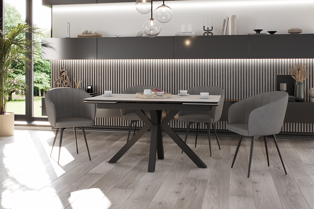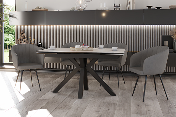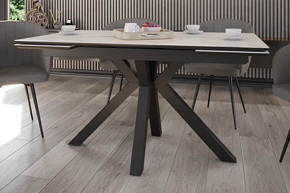 Обеденный стол SPARTA LIGHT 140 MARBLE MATT CER — современная эстетика и стильный центр притяжения. Его мощные изогнутые ножки придают конструкции не только устойчивость, но и динамичный характер, идеально вписывающийся в интерьеры с акцентом на смелый минимализм. Базовая длина стола — 140 см, а с помощью выдвижных боковых вставок он легко увеличивается на 30 см с каждой стороны, создавая пространство для семейных обедов и праздников. Столешница и вставки из керамики цвета белого мрамора сочетают благородный внешний вид с практичностью. Бесшовный переход рисунка на выдвижные элементы создает иллюзию цельной поверхности — даже в разложенном виде стол выглядит как гармоничное произведение искусства. Керамика устойчива к царапинам, горячей посуде и случайным пятнам, сохраняя безупречный вид даже при интенсивном использовании. Подложка из МДФ обеспечивает дополнительную прочность и защиту, делая стол долговечным решением для повседневной жизни.