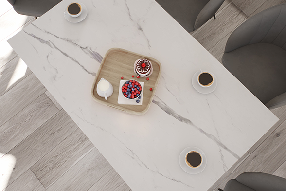 Керамика — эстетичный и благородный натуральный материал, представленный в разнообразных оттенках и фактурах. Выполненные из него столешницы служат десятилетиями: за счет плотной структуры и высокой прочности им не страшны царапины, постоянный прямой контакт с влагой и перепады температуры.