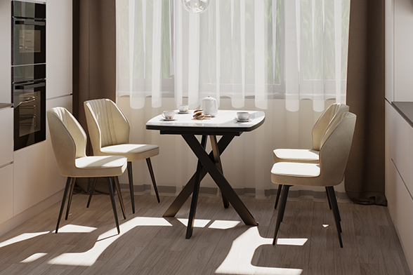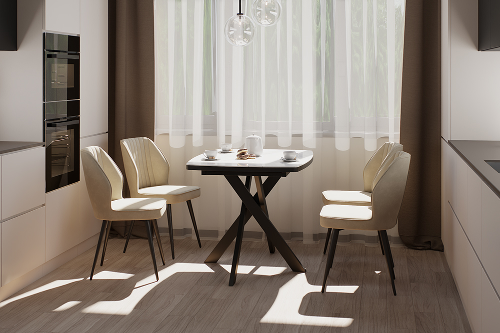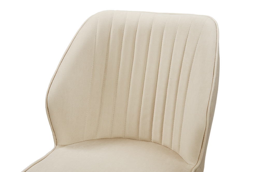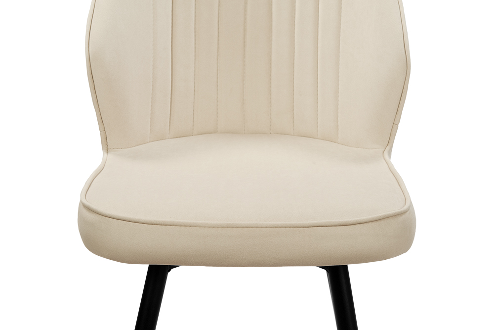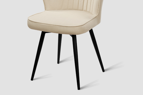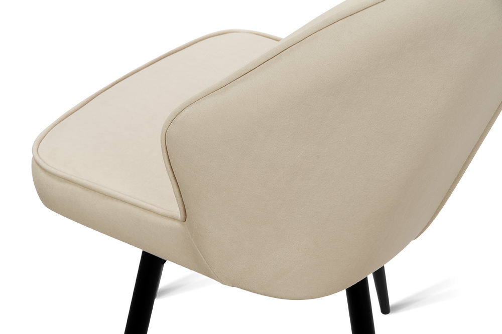 Обеденный стул В521-m CAP BK — это баланс сдержанного дизайна и ежедневного удобства. Его эргономичная форма с выраженной боковой поддержкой и вертикальной декоративной строчкой обеспечивает комфорт даже во время продолжительных посиделок за столом. Поворотный механизм на 360 градусов обеспечивает плавное вращение — легко следите за беседой, дотягиваетесь до дальних блюд или просто меняете ракурс, не вставая с места. Обивка выполнена из мягкого, практичного велюра светло-бежевого цвета, устойчивого к загрязнениям и не боящегося когтей домашних питомцев, что делает стул идеальным для активной семейной жизни. Чёрные металлические ножки придают модели строгий, завершённый вид и гарантируют надёжную устойчивость.