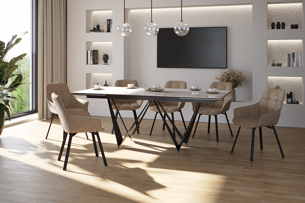 Дизайнерский стул с металлическим каркасом с поворотным сиденьем. Изготовлен в актуальной манере, обивка – экокожа цвета «латте». Ножки из металлического сплава в виде расходящихся лучей. Обивка оформлена в оригинальной стеганной манере. Особенности данной модели стула - это высокая и объемная спинка, большие подлокотники, форма, напоминающая уютное кресло на ножках. А также наличие поворотного механизма сиденья, который позволяет занять максимально комфортное расположение. Повороты выполняются непринужденно, без шума и больших усилий. Продуманная конструкция для максимального уюта позволяет расслабиться и отдохнуть, сидя на таком стуле.