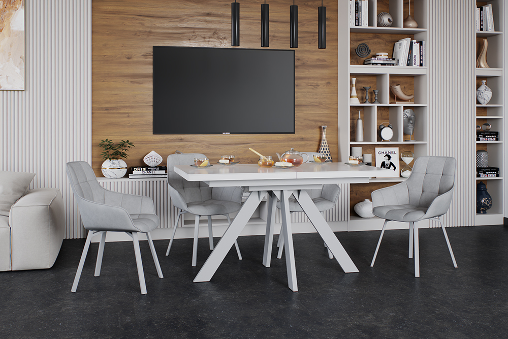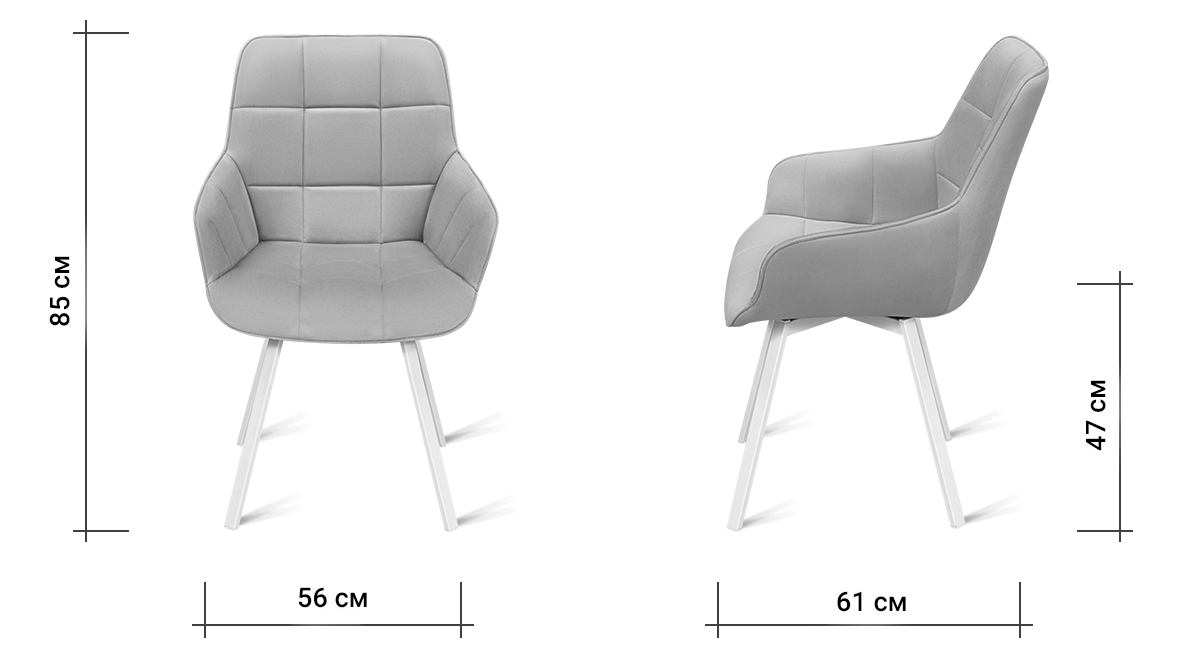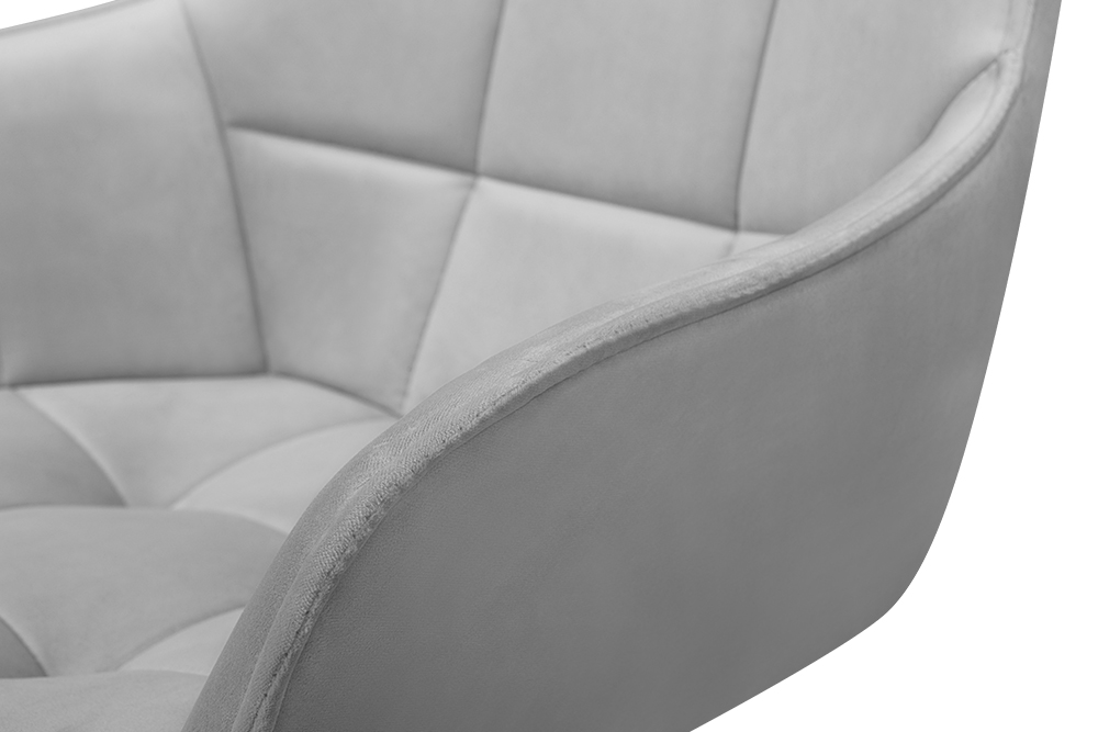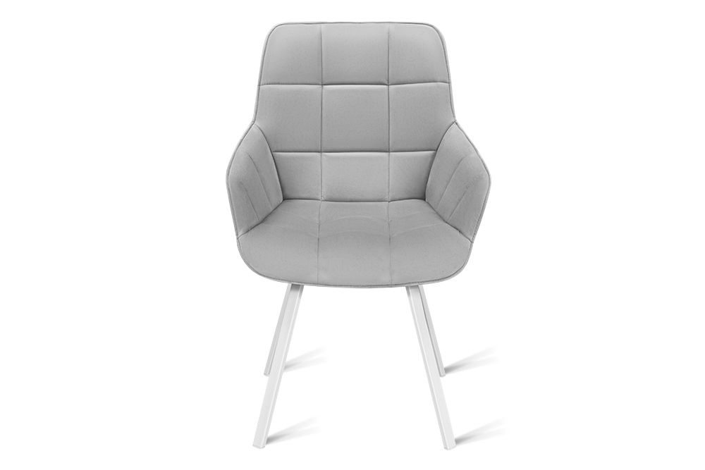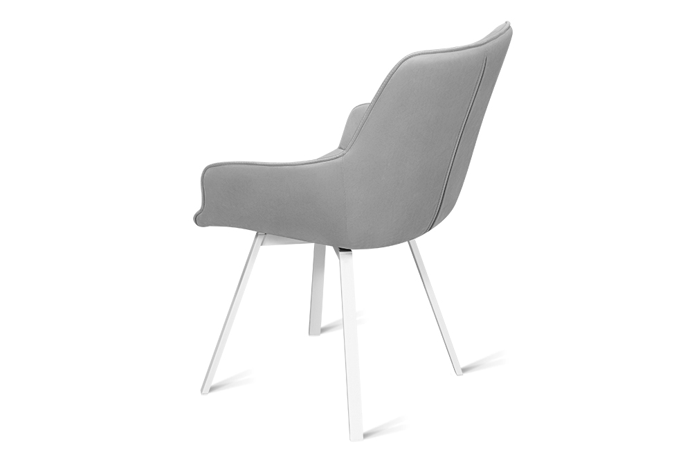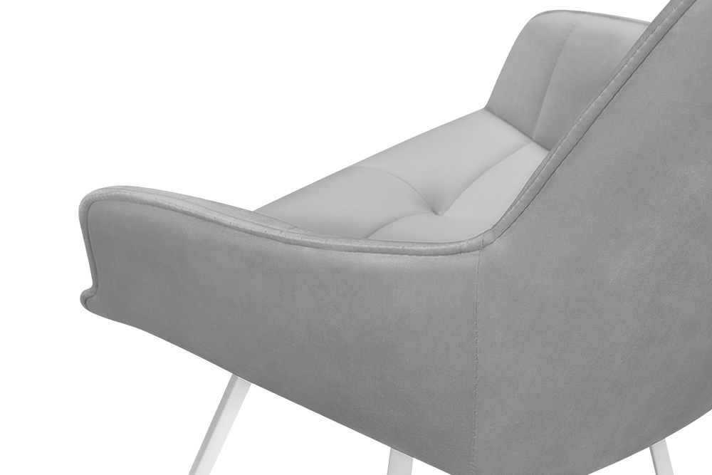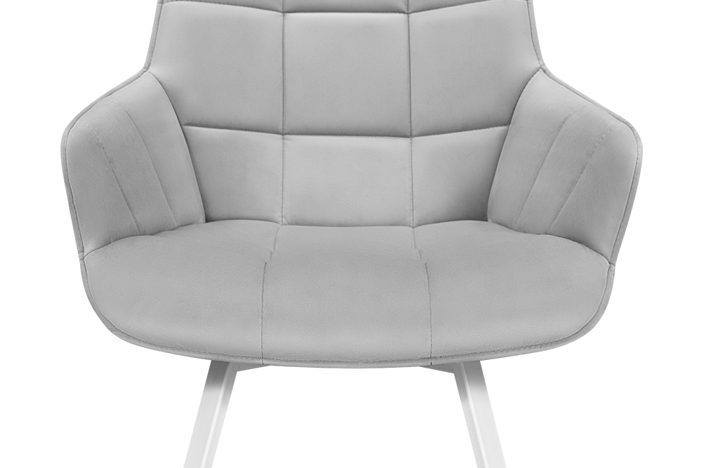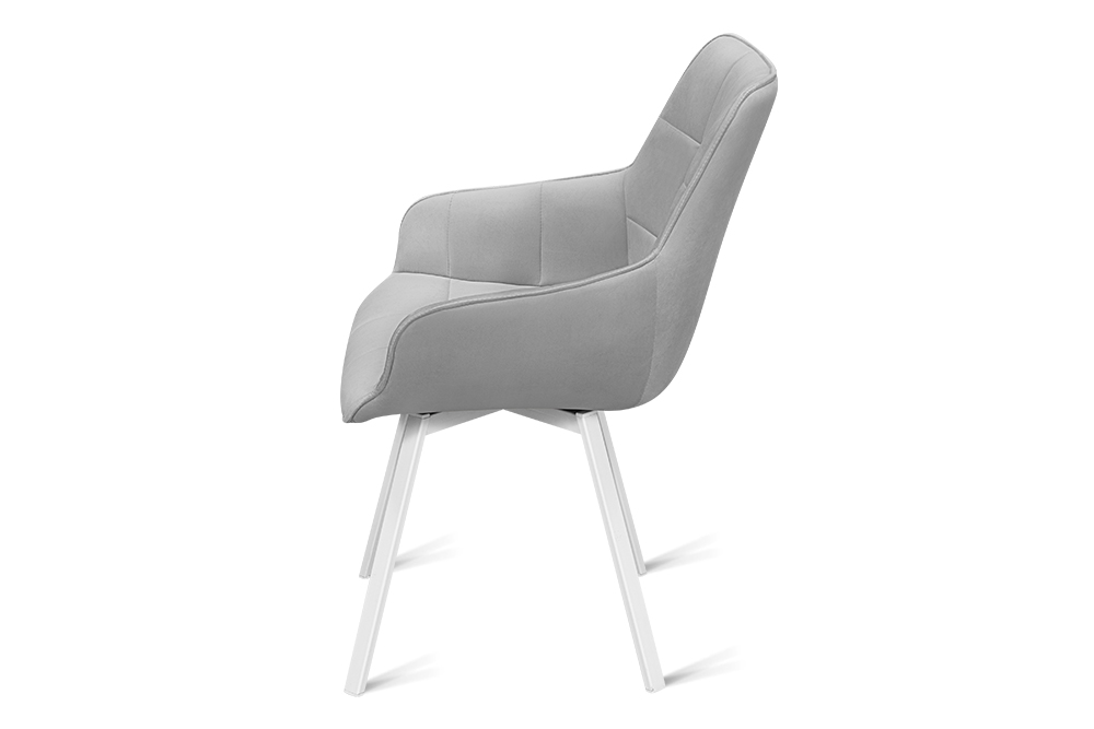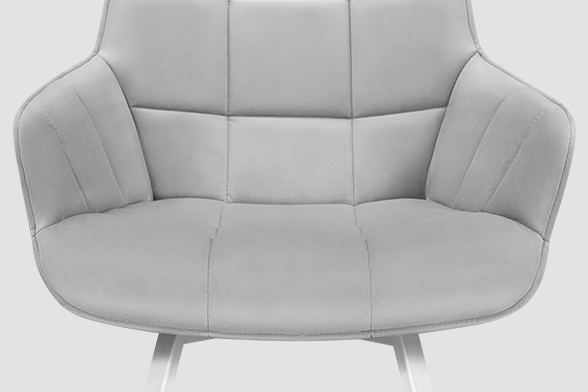 Дизайнерский стул с металлическим каркасом с поворотным сиденьем. Изготовлен в актуальной манере, обивка – премиальный велюр светло-серого цвета. Ножки белого цвета из металлического сплава в виде расходящихся лучей. Обивка оформлена в оригинальной стеганной манере. Особенности данной модели стула - это высокая и объемная спинка, большие подлокотники, форма, напоминающая уютное кресло на ножках. А также наличие поворотного механизма сиденья, который позволяет занять максимально комфортное расположение. Повороты выполняются непринужденно, без шума и больших усилий. Продуманная конструкция для максимального уюта позволяет расслабиться и отдохнуть, сидя на таком стуле.
