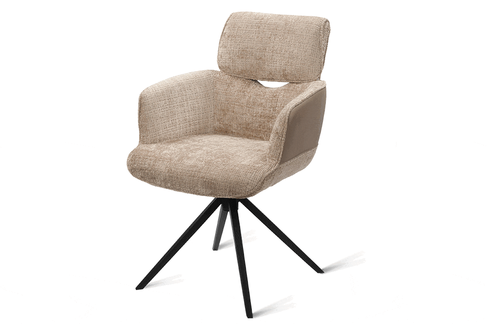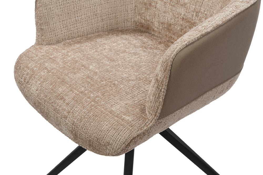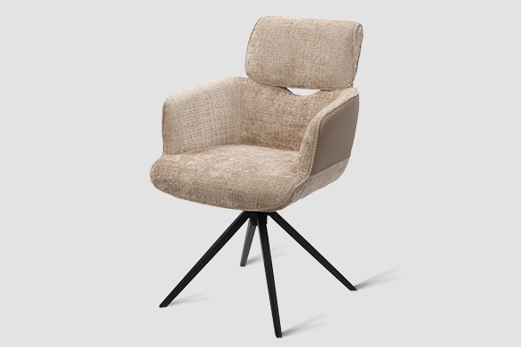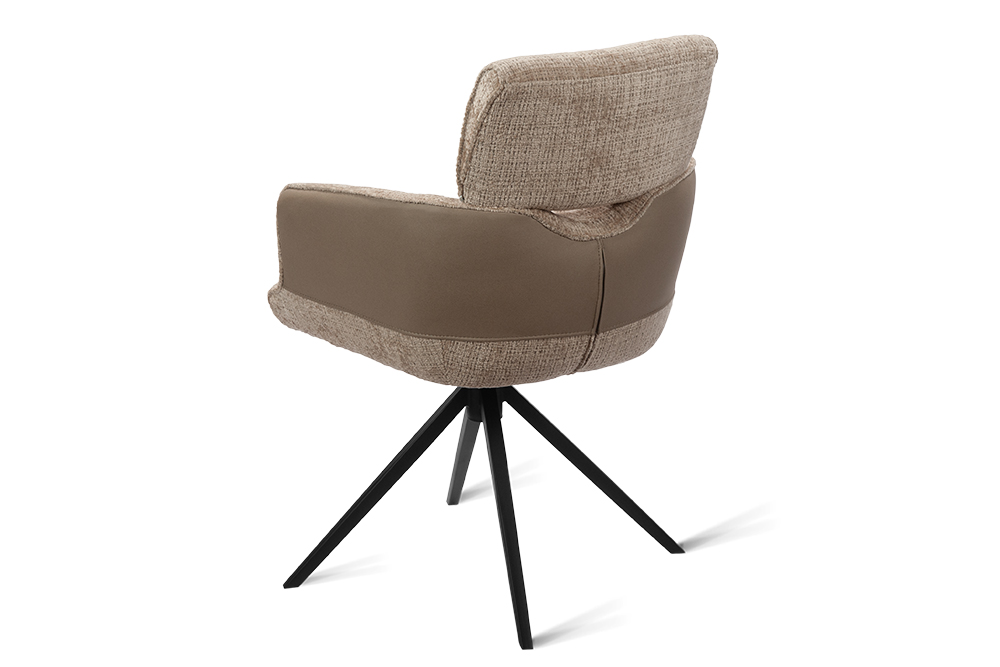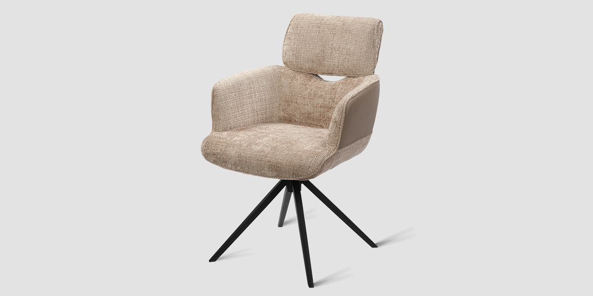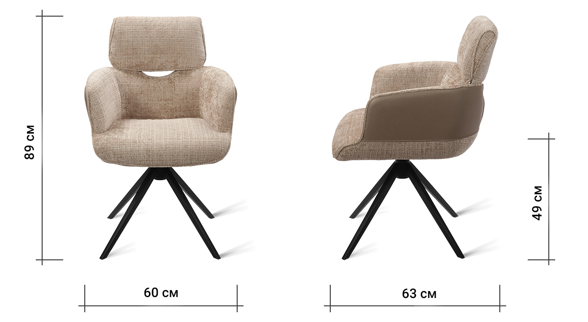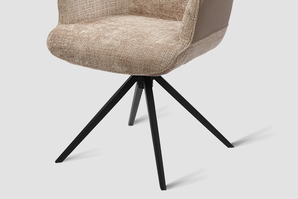 Стул-кресло B920 REUSS LATTE — комфорт и долговечность для любого уголка вашего дома. Удобная форма с мягким подголовником и возвратно-поворотным механизмом обеспечивает идеальную поддержку и плавное вращение на 180 градусов с автоматическим возвратом — легко повернитесь к собеседнику за столом, к зеркалу или к монитору. Стул-кресло всегда возвращается в исходное положение, сохраняя аккуратный и организованный вид вашей обстановки. Комбинированная обивка выполнена в гармоничной гамме: практичный шенилл цвета латте в контактных зонах выдерживает до 70 000 циклов истирания, подтверждая свою исключительную износостойкость, а мягкая экокожа темно-бежевого цвета с текстурой под замшу добавляют тактильный комфорт и облегчают уход. Лучеобразные ножки из чёрного металла придают конструкции лёгкость, устойчивость и завершают современный внешний вид. B920 REUSS LATTE органично дополнит обеденную зону, туалетный столик или рабочее место, сочетая в себе надёжность для ежедневного использования и сдержанную элегантность.